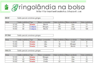 Bom pessoal, fechamos mais um mês de festa por parte da gringolândia, décimo consecutivo e principalmente por parte das corretoras estrangeiras que acompanhamos liderados por Credit, Merrill e Morgan, somando mais de 2.4bilhões em compras. Já os investidores estrangeiros não estão com este saldo todo não como já vimos acompanhando durante o mês e divulgaremos na quarta-feira, quando sai o resultado oficial pela BM&F/Bovespa. Mas é inegável que o volume dessas corretoras é bastante considerável no dia a dia da bolsa, conforme evolução do último gráfico representado.