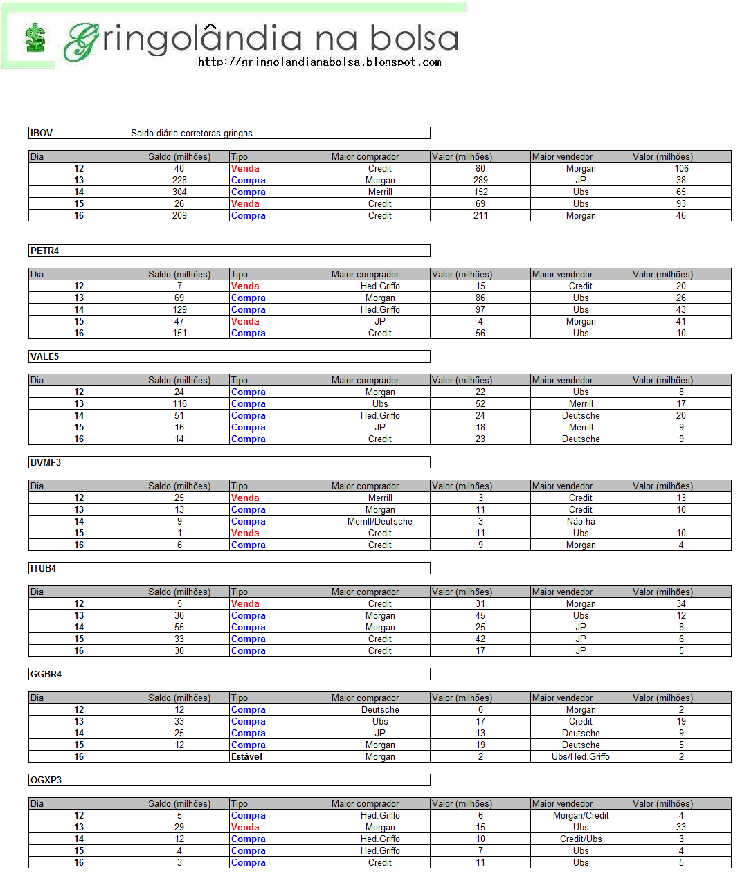 - Por outro lado observamos que continuam dominando ponta de compra as corretoras Ubs, Credit e Morgan Stanley. Merrill Lynch vem se aproximando destas formando um possível quarteto fantástico (risos).