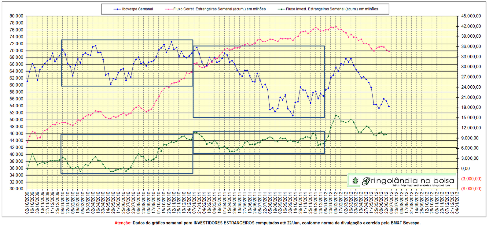 Em 2012 o fluxo oficial estrangeiro está positivo em 2.751bilhões. Junho o saldo está negativo em 163milhões (até dia 22), conforme evolução diária abaixo em relação ao Ibovespa.